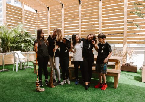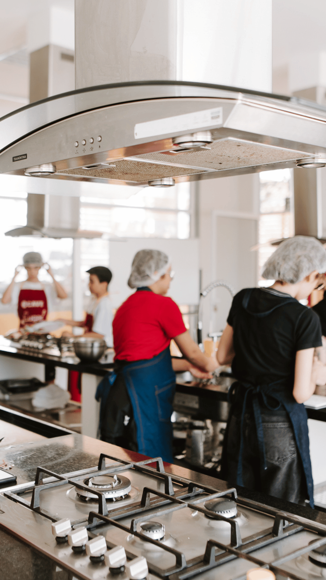 Oficina de gastronomia, em que os estudantes aprendem conceitos básicos da culinária, a utilizar alimentos de formas diversas, aprendendo a evitar o desperdício, em uma cozinha com sustentabilidade. Nossa cozinha possui 4 ilhas de preparação, equipadas com cooktop e coifas, além do forno profissional do espaço.